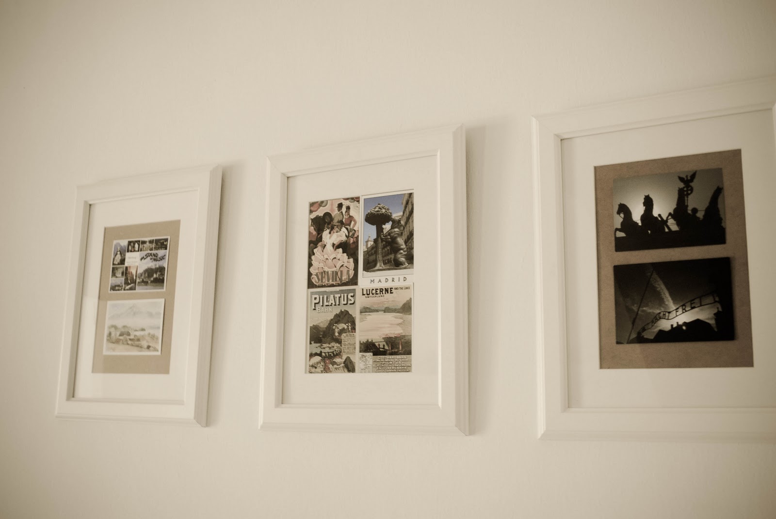 ♥ Pretty white picture frames with postcards from all around the world adorning our dinner table wall.